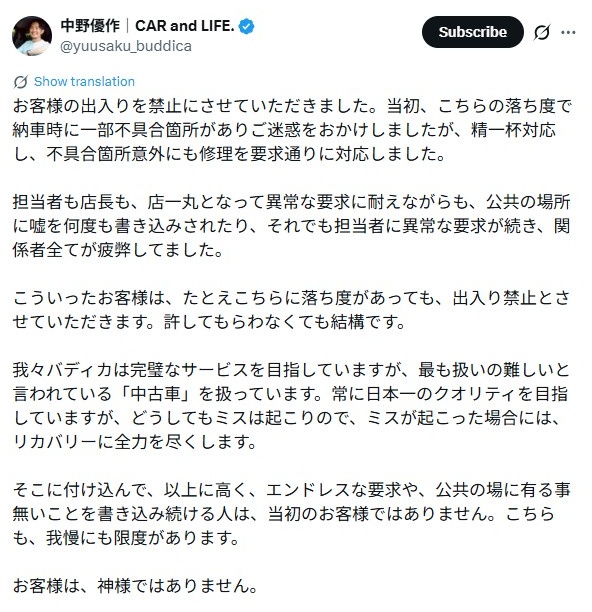 バディカという会社が、特定のお客さんに対して「もううちの店には来ないでほしい!」という出禁の対応をとっていることは、中古車業界だけでなく多くのビジネス界でも話題になっている。