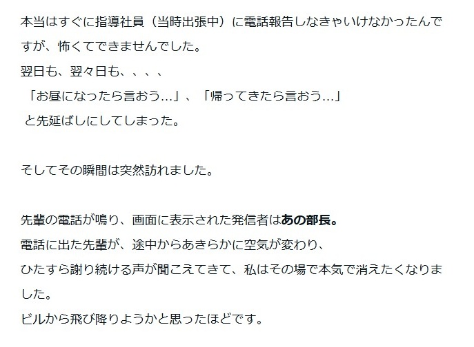 これは、新人だったある社員が1つのミスをして、部長に怒鳴られた時のエピソードだが、当時この社員は怖くて「ビルから飛び降りようかと思ったほどです。」と表現している。。