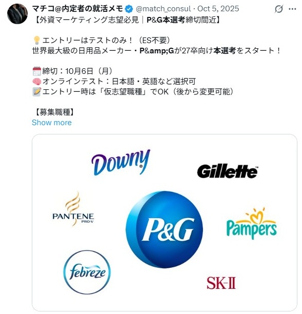 - P&Gの選考フロー時期は早くて何回もある
