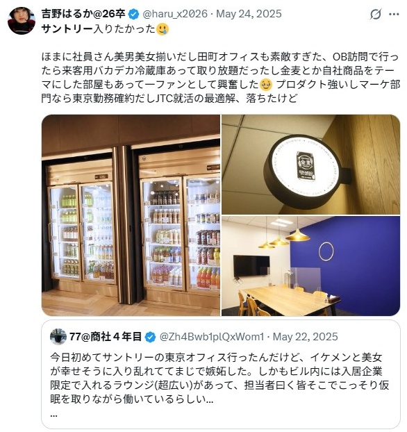 学生たちは人事の姿を通して、サントリーの商品が持つ「洗練された世界観」を無意識のうちに受け取っているのだ。掲示板やSNSで「人事がかわいい!」と騒がれるのは、彼らが自社の看板を背負い、一分一秒たりとも気を抜かずに「サントリーらしさ」を発信し続けている証拠でもある。