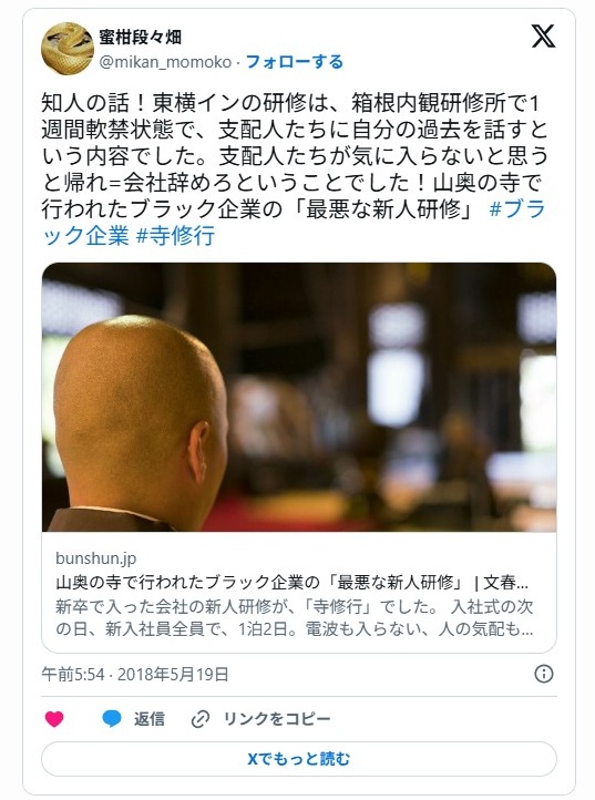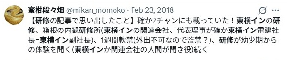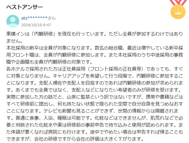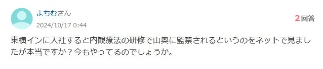 東横インに入社すると内観療法の研修で山奥に監禁されるというのをネットで見ましたが本当ですか?今もやってるのでしょうか。