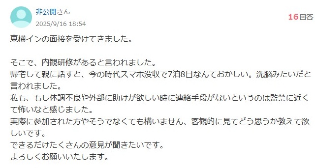 東横インの面接を受けてきました。そこで、内観研修があると言われました。帰宅して親に話すと、今の時代スマホ没収で7泊8日なんておかしい。洗脳みたいだと言われました。私も、もし体調不良や外部に助けが欲しい時に連絡手段がないというのは監禁に近くて怖いなと感じました。